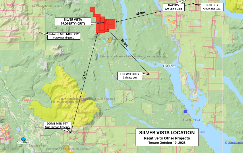 - The Silver Vista property is located in northcentral BC, approximately 55 air-km northeast of the town of Smithers and 300 km NW of northern B.C.'s regional hub city of Prince George.